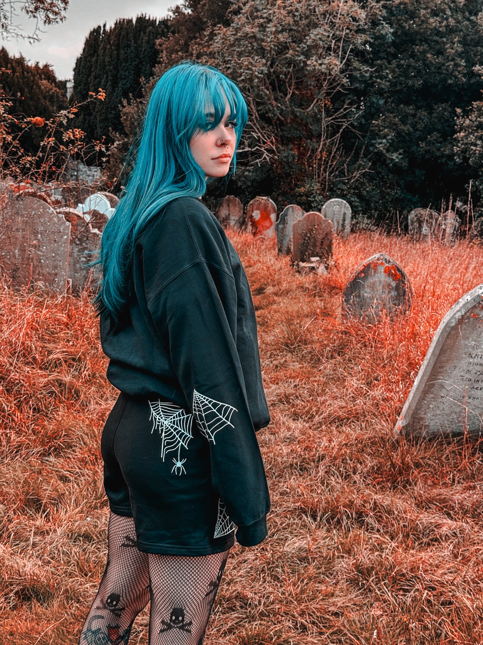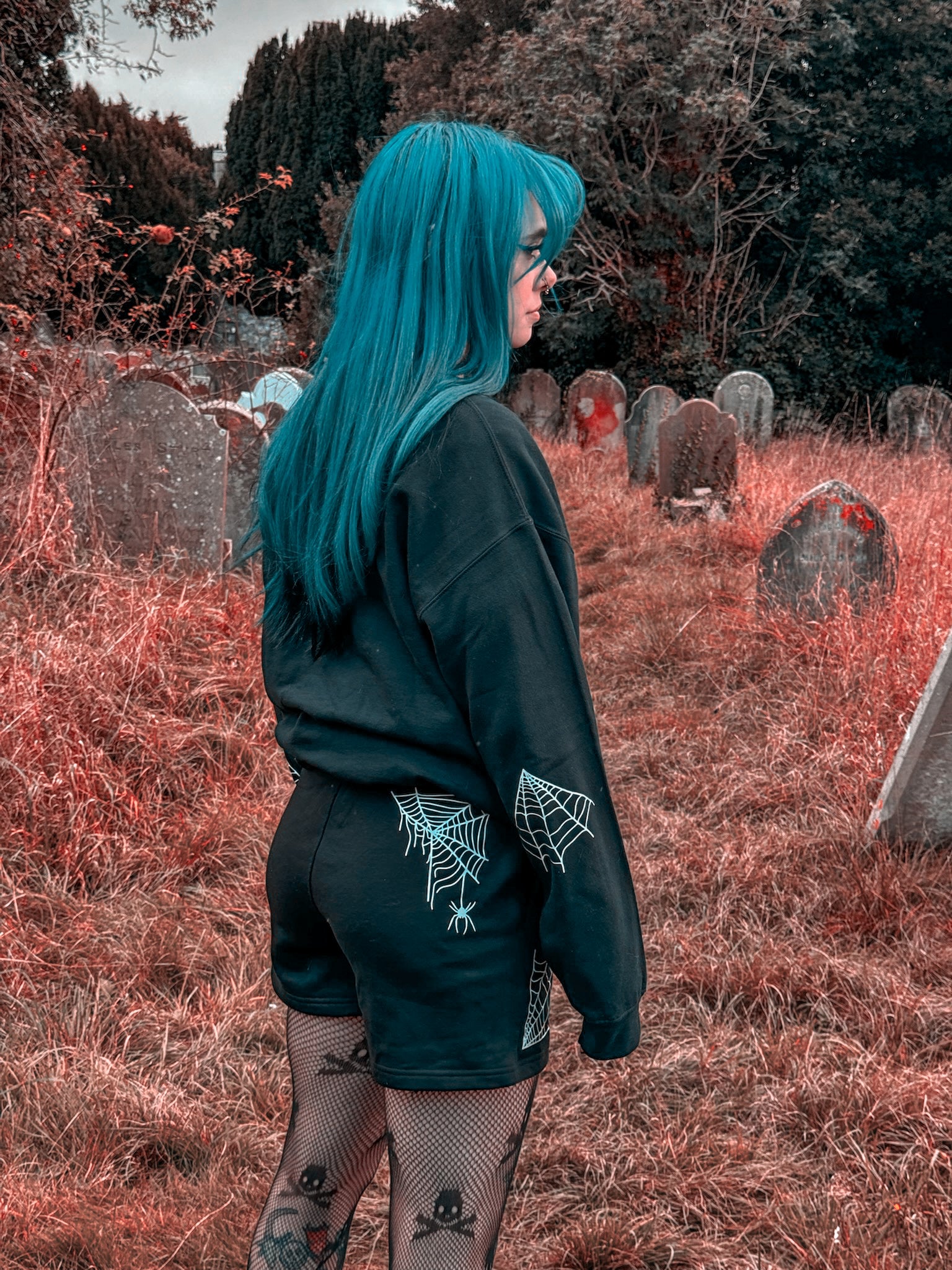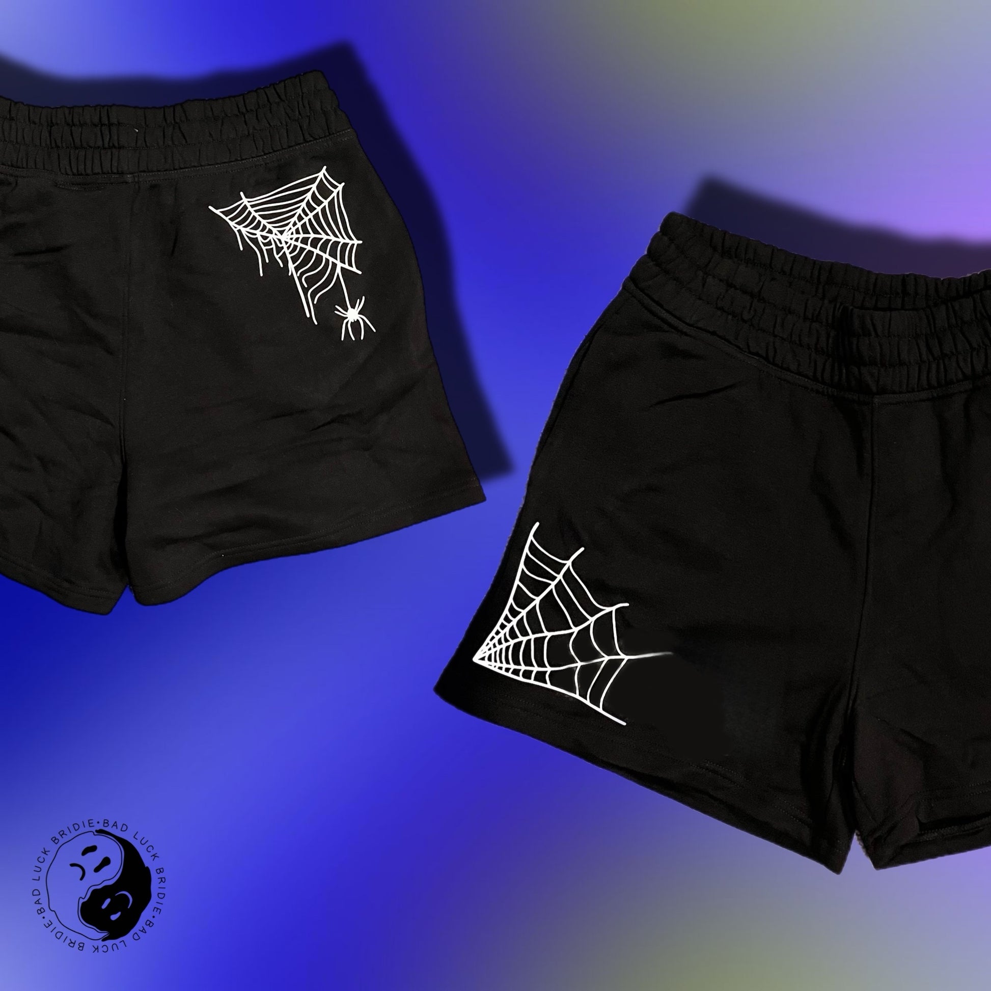 part of the new spooky szn vol.5 the 'cobweb' shorts with front and back print