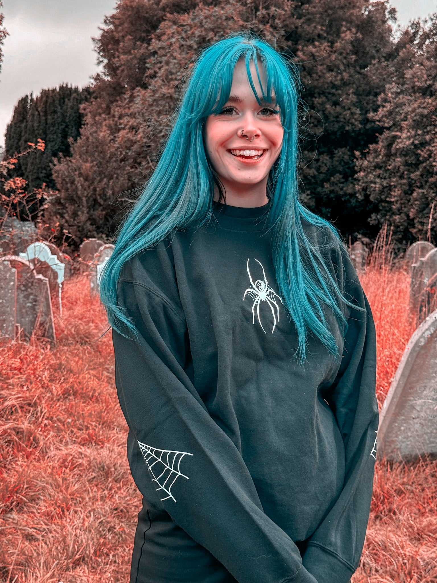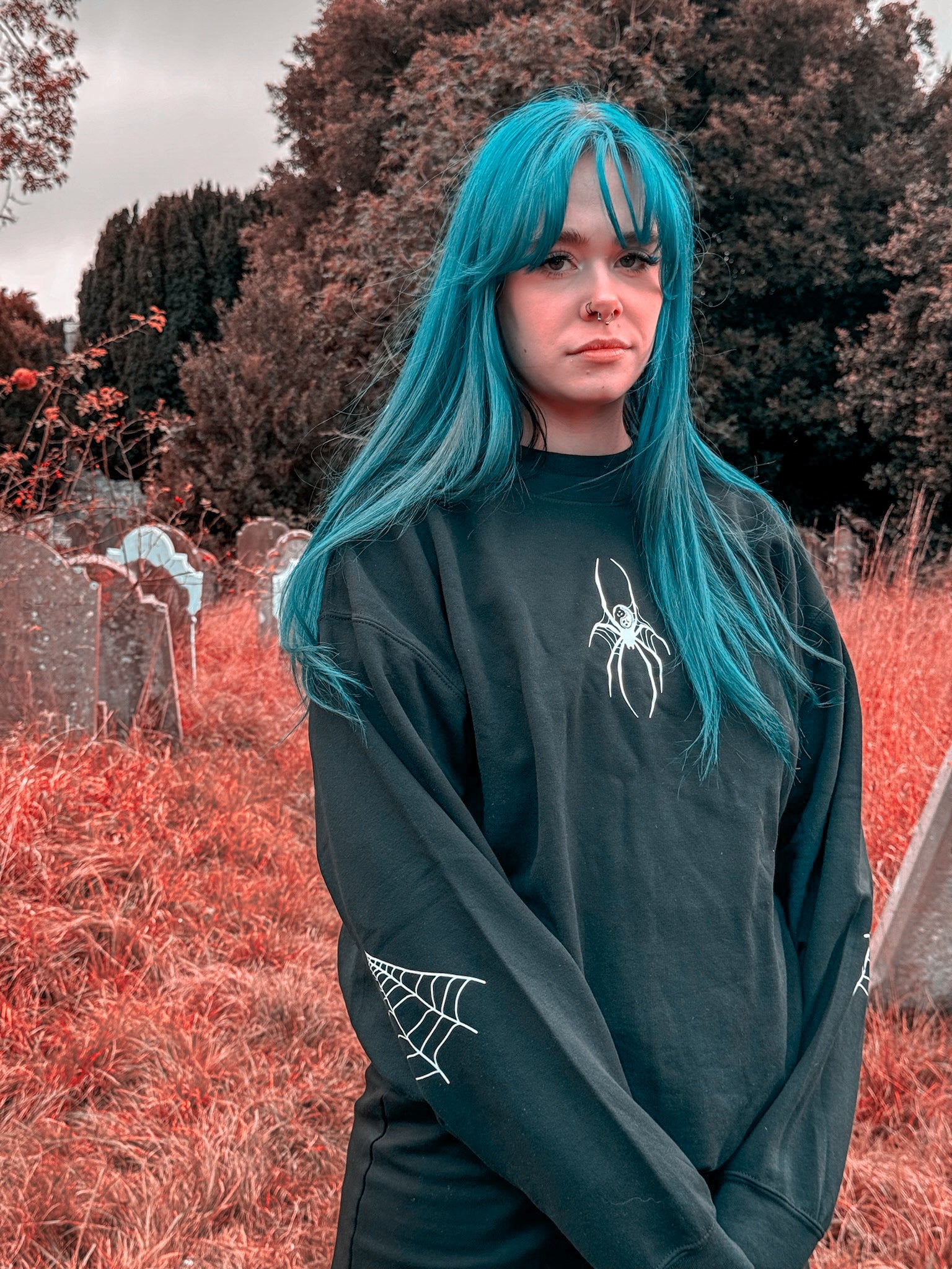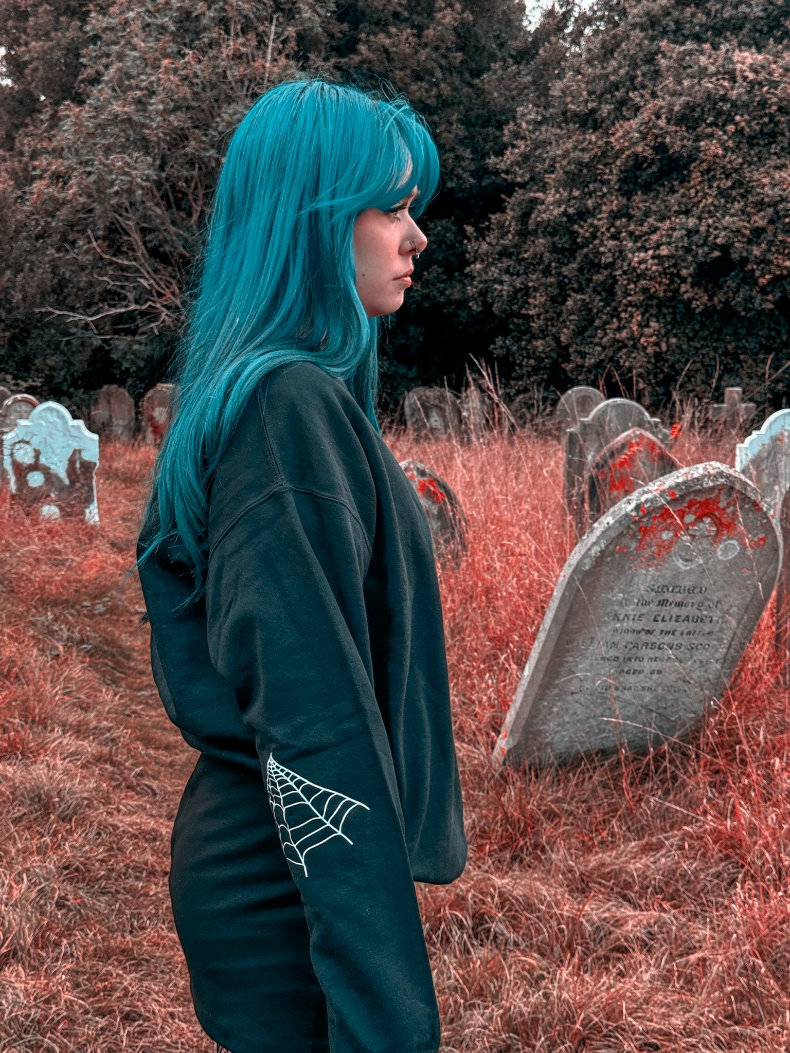 part of the new spooky szn vol.5 the 'cobweb' sweatshirt elbow and front graphic