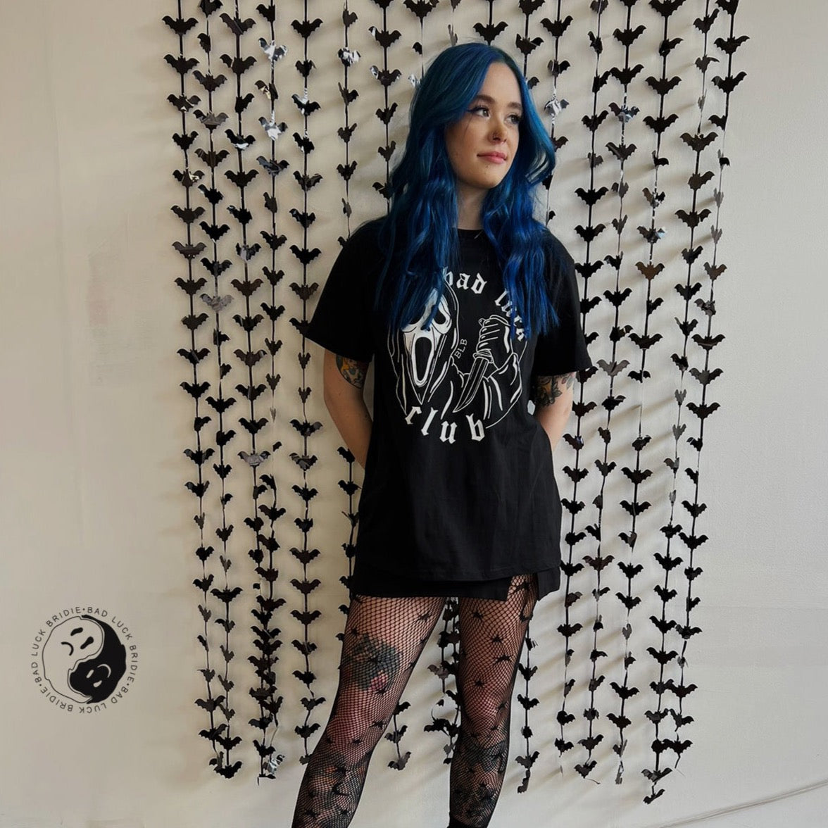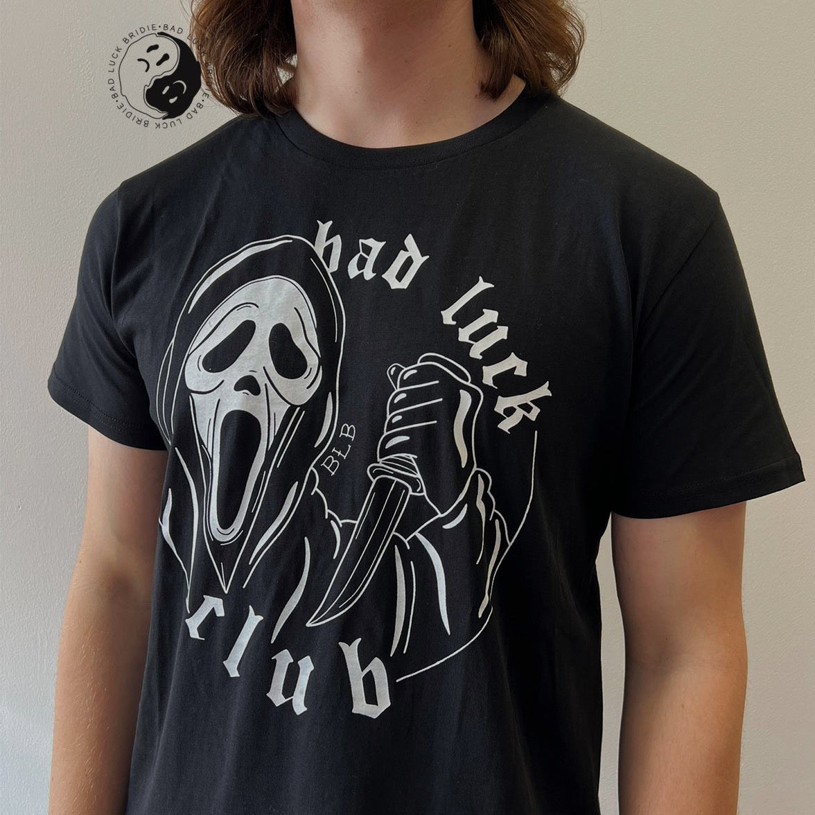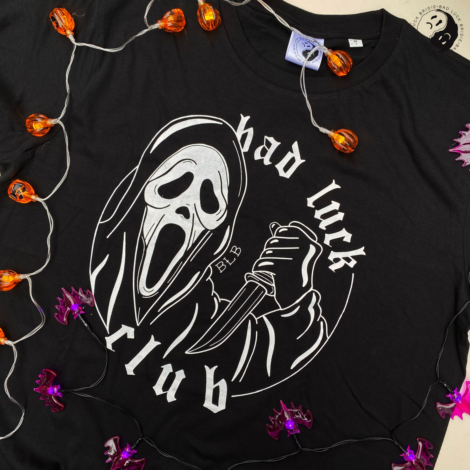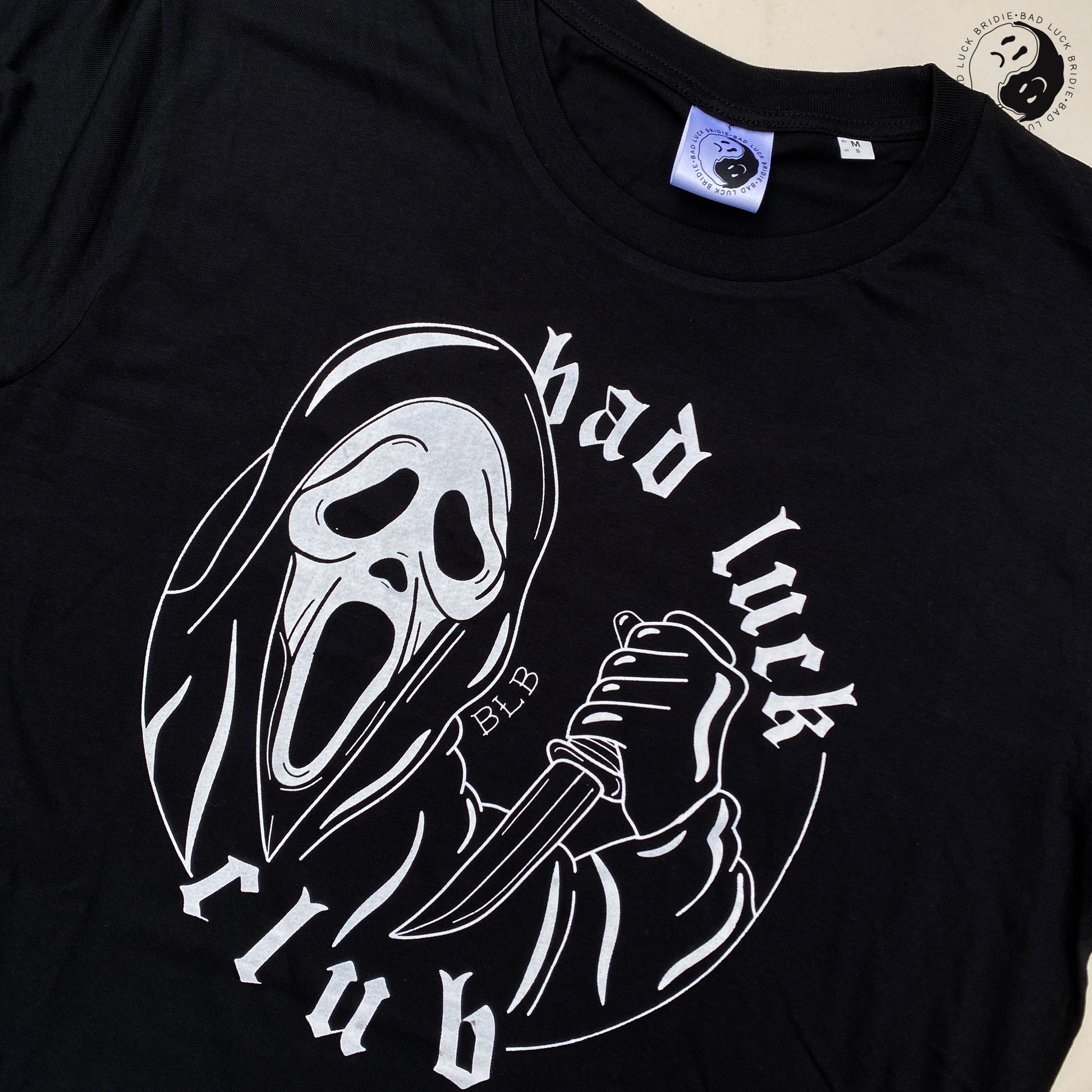 The Bad Luck Club ghost face t-shirt part of the new spooky season vol.3 collection! printed on a black tee in white