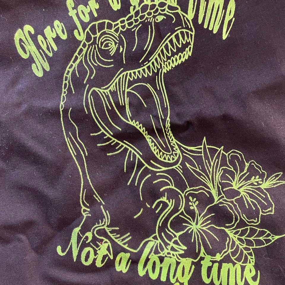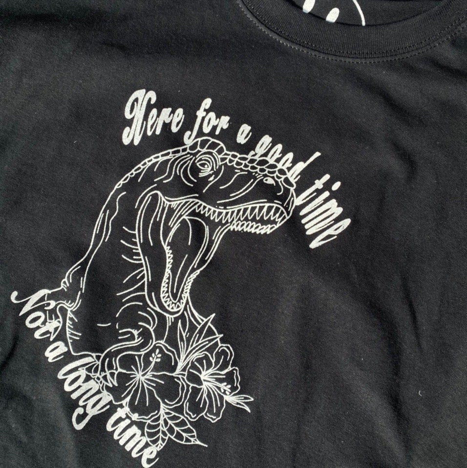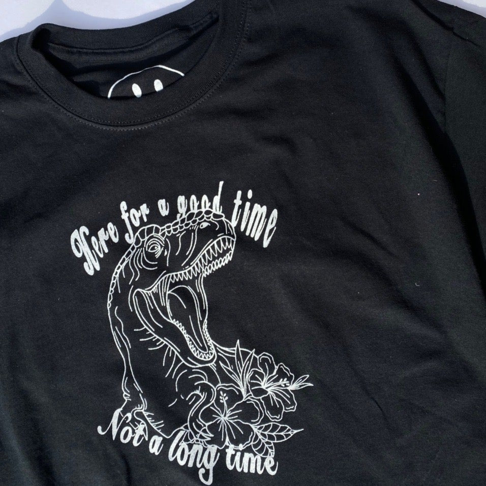 here for a good time, not a long time dino print on black tee (if wanted to be printed in green add the colour in the description!)