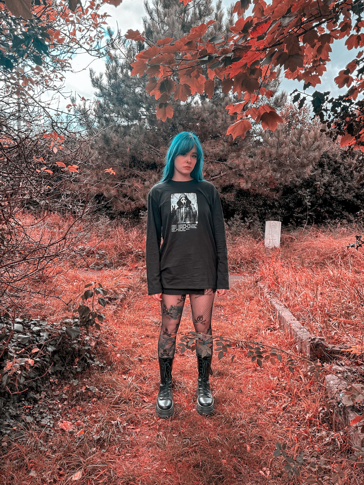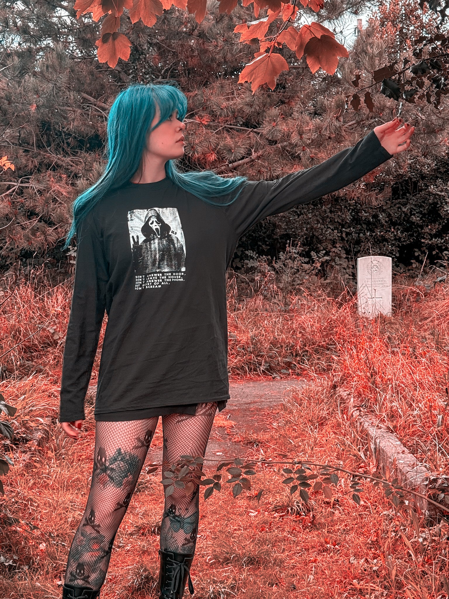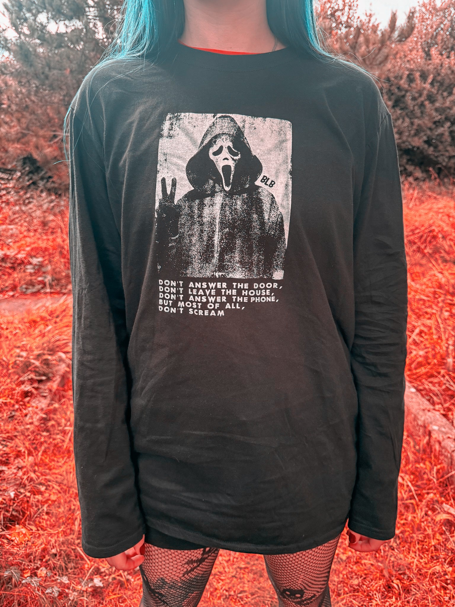 part of the new spooky szn vol.5 the 'don't scream' long sleeve with front graphic