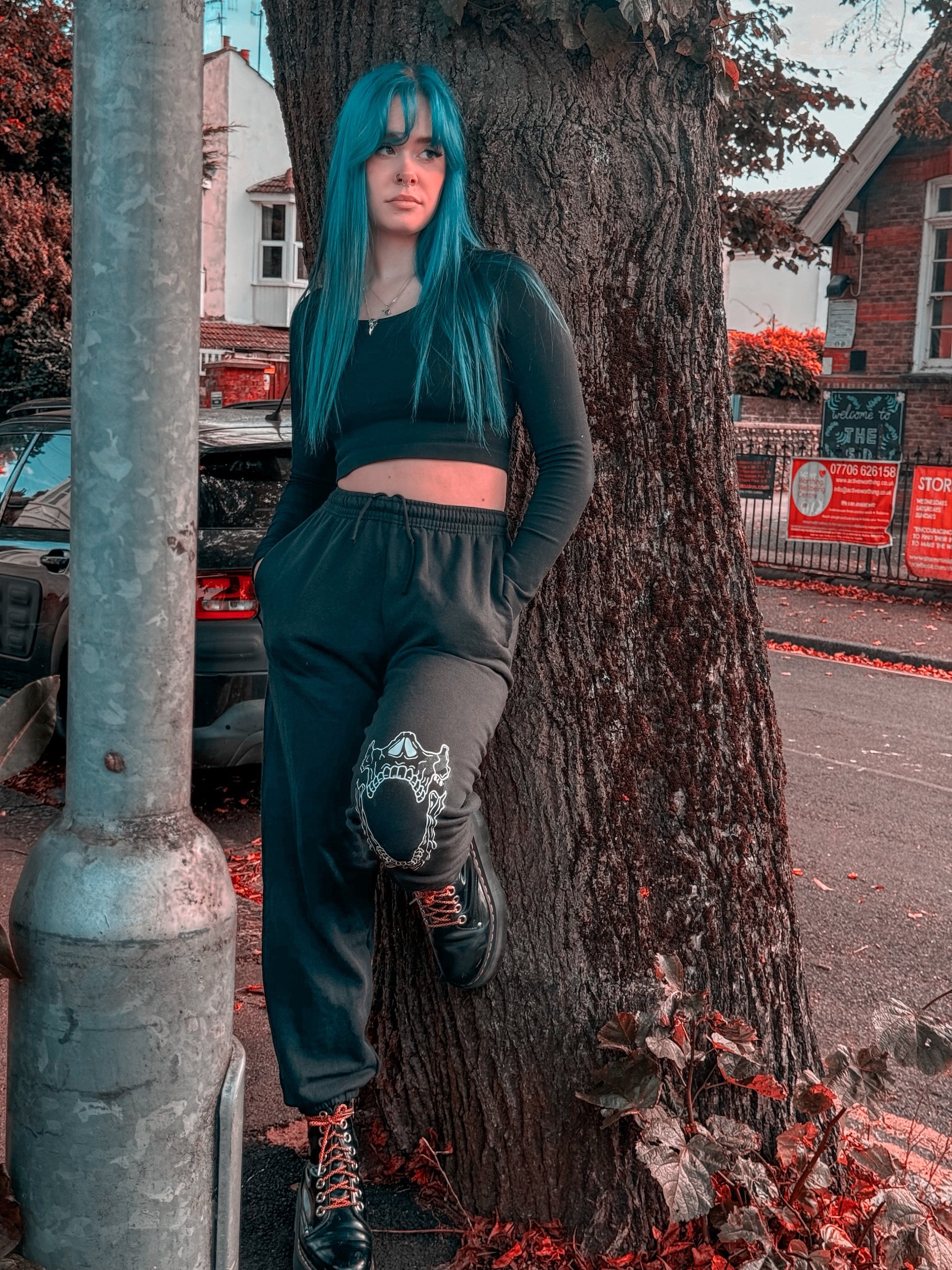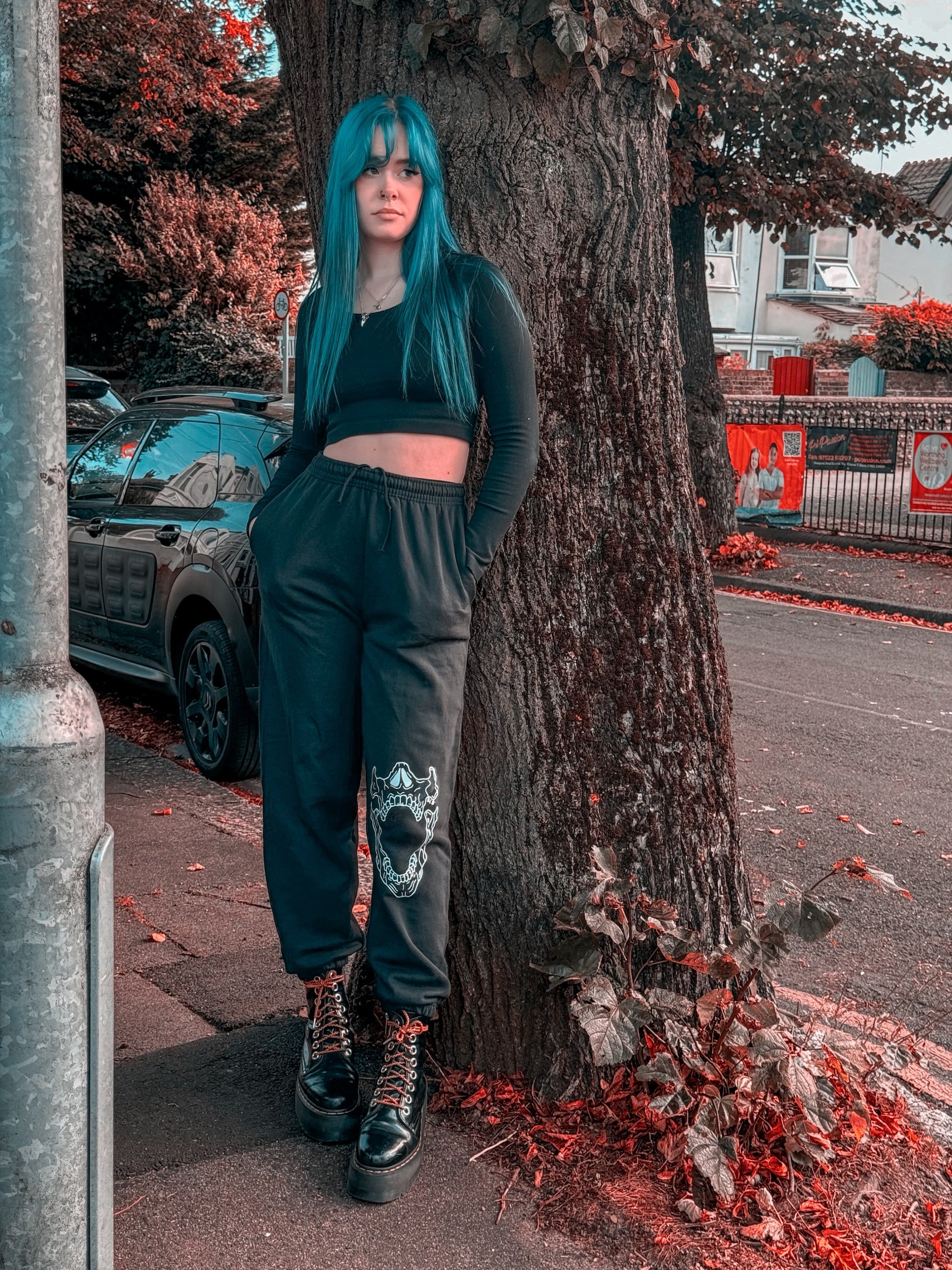 part of the new spooky szn vol.5 the 'jawbreaker' joggers with knee graphic