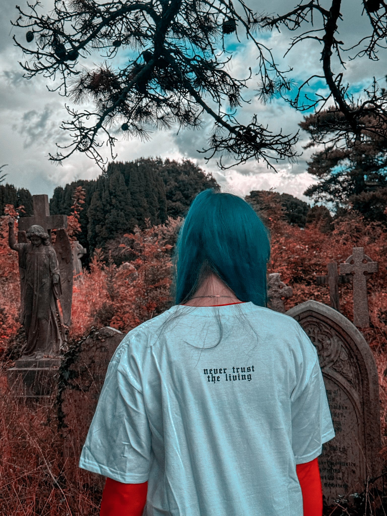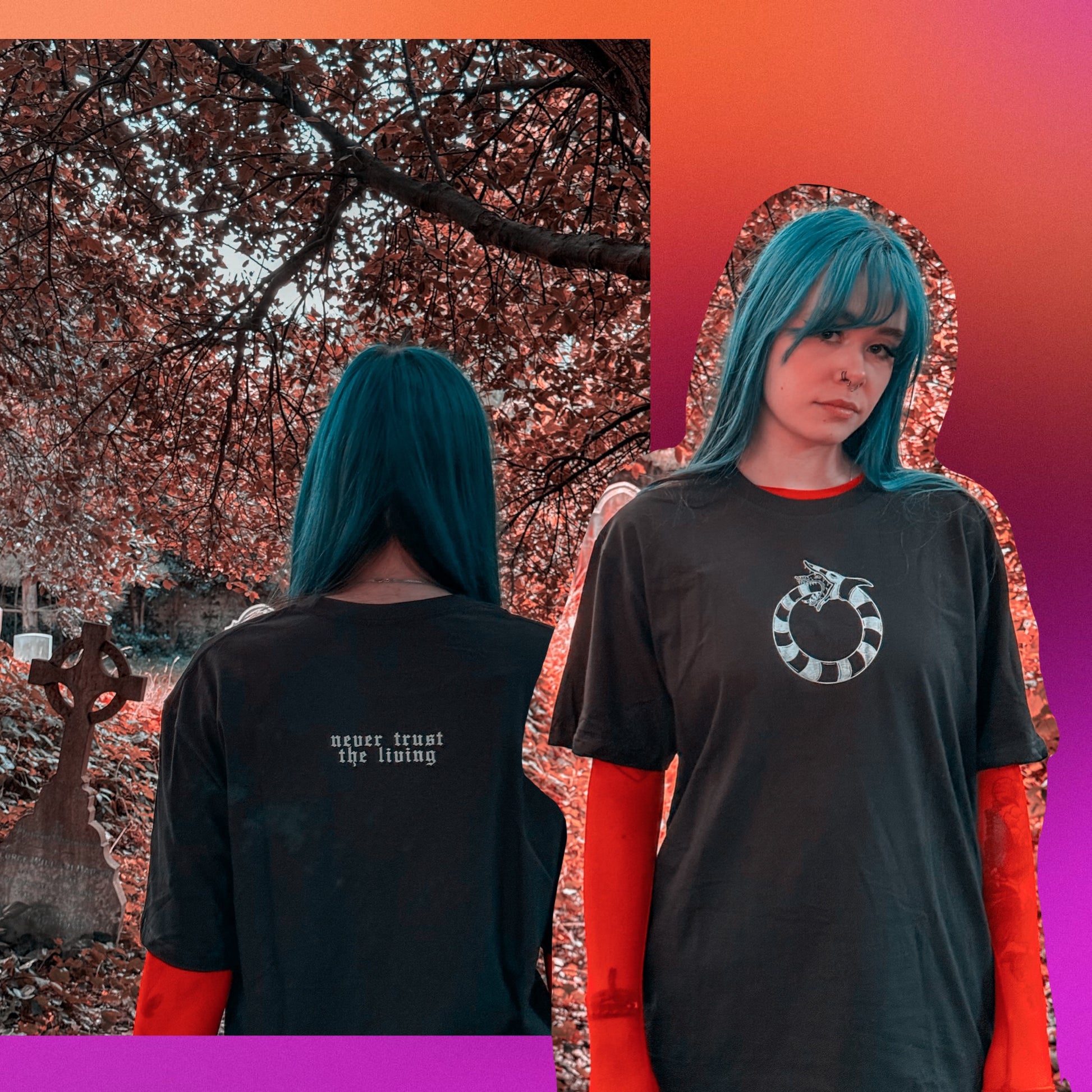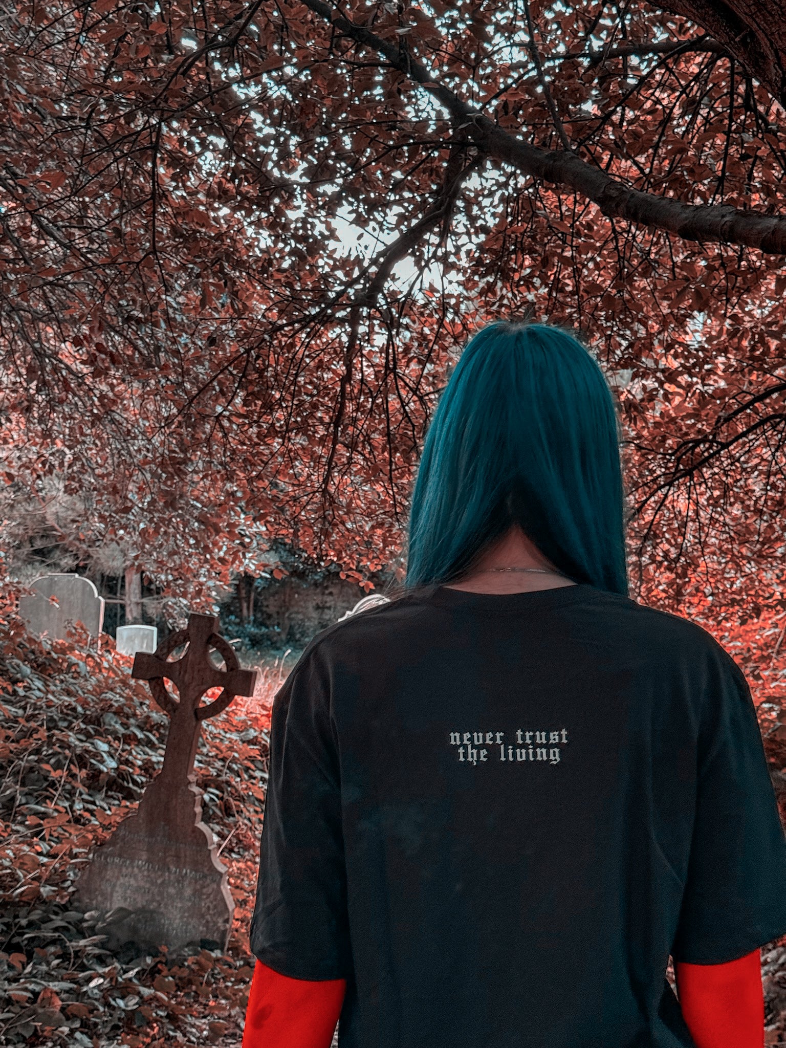 part of the new spooky szn vol.5 the 'never trust the living' tee with back and front graphic in black or white