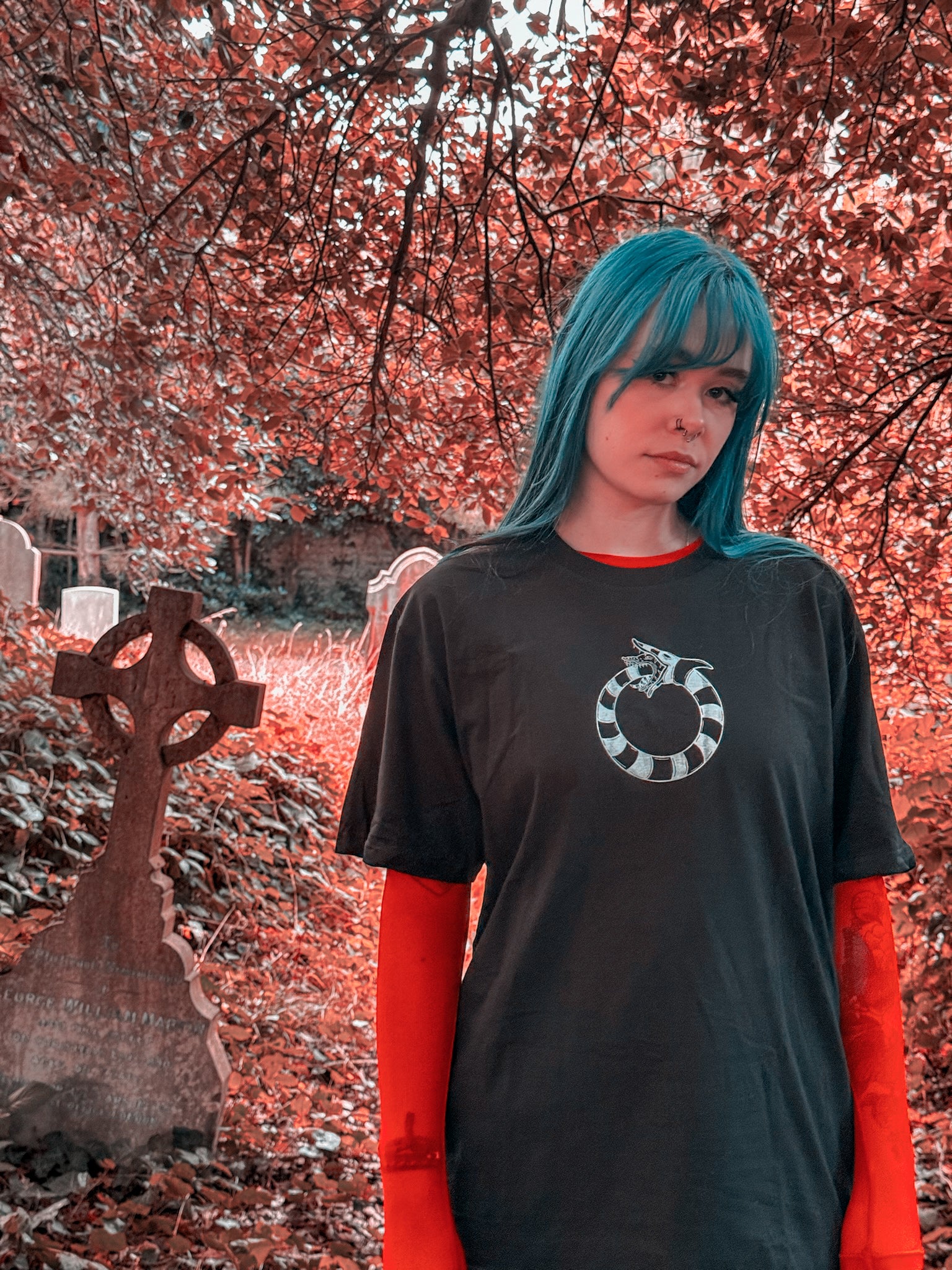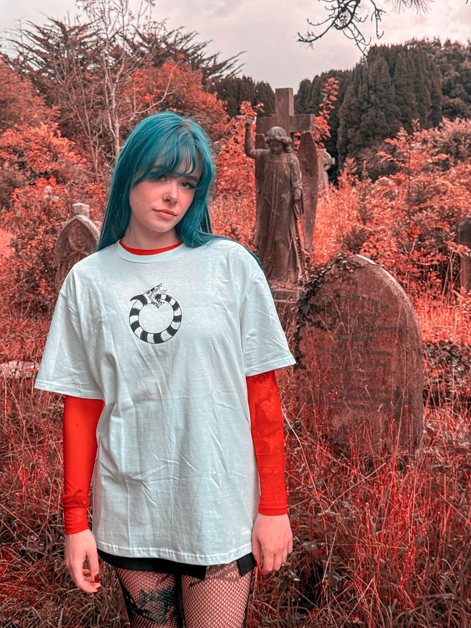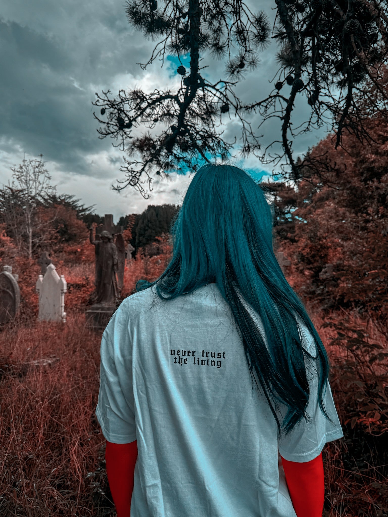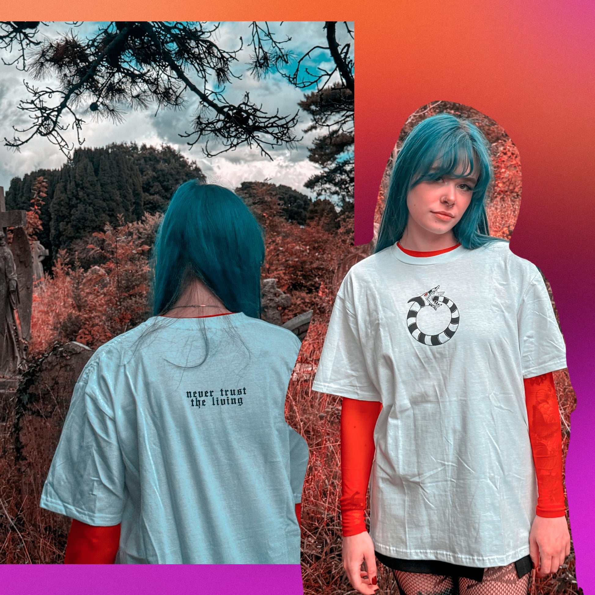 part of the new spooky szn vol.5 the 'never trust the living' tee with back and front graphic in black or white
