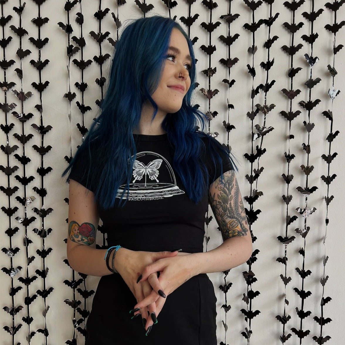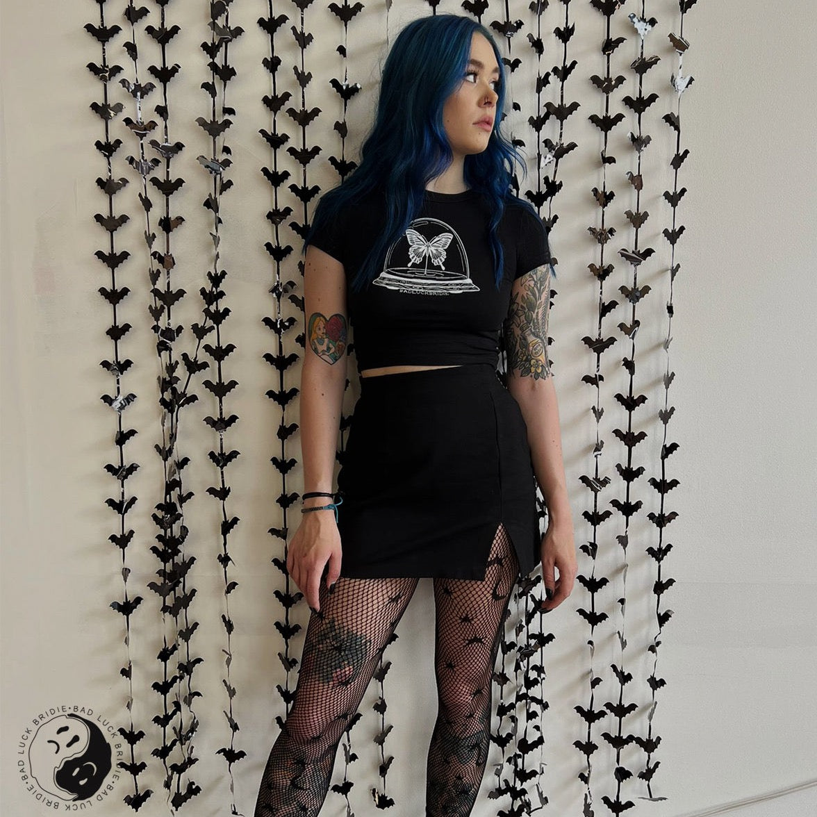 the lepidopterist cropped t-shirt part of the new spooky season vol.3 collection! printed on a black babydoll tee